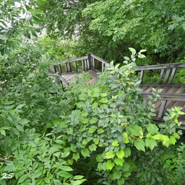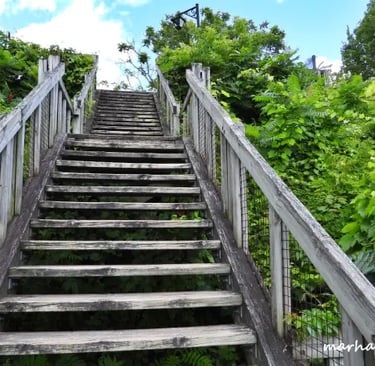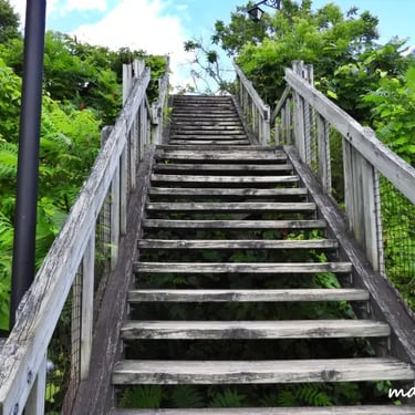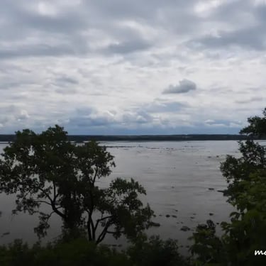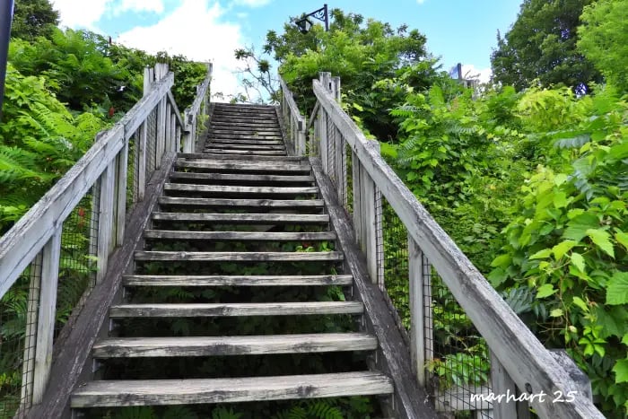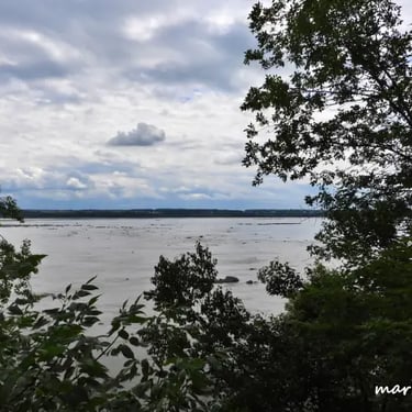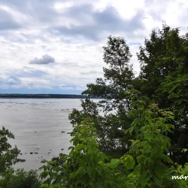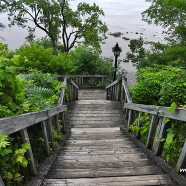 Un vaste escalier sinueux mène à une plage secrète du fleuve Saint-Laurent, située sur le site du Cap Lauzon, au milieu du Parc Municipal de Deschambault.